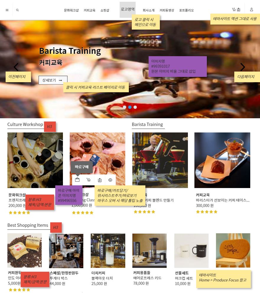 - 확정된 워드프레스 테마에 있는 디자인과 기능 부분을 캡쳐하여 작성한다.