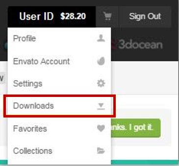 원하는 테마를 구입한 후 로그인 상태에서 상단의 계정 ID에 마우스를 올리면 아래와 같은 메뉴가 표시됩니다. 표시되는 메뉴 중에서 [Downloads]를 선택하면 구입한 테마를 다운로드 할 수 있는 페이지로 이동합니다.