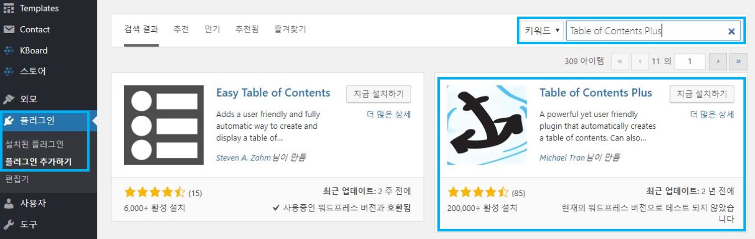 그리고 검색에 Table of Contents Plus 를 입력합니다. 그러면 아래와 같이 [Table of Contents Plus] 플러그인이 뜹니다. [지금 설치하기]를 클릭하시면 됩니다.
