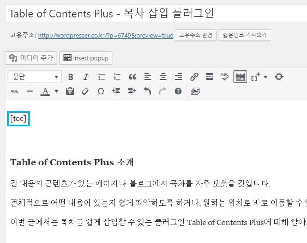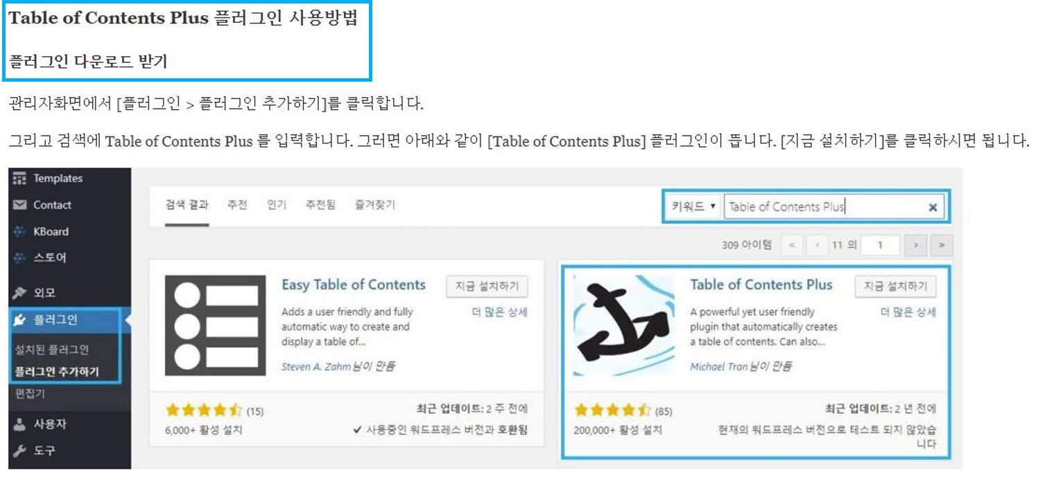이번 글에서는 목차를 쉽게 삽입할 수 있는 플러그인 Table of Contents Plus에 대해 알아보도록 하겠습니다.